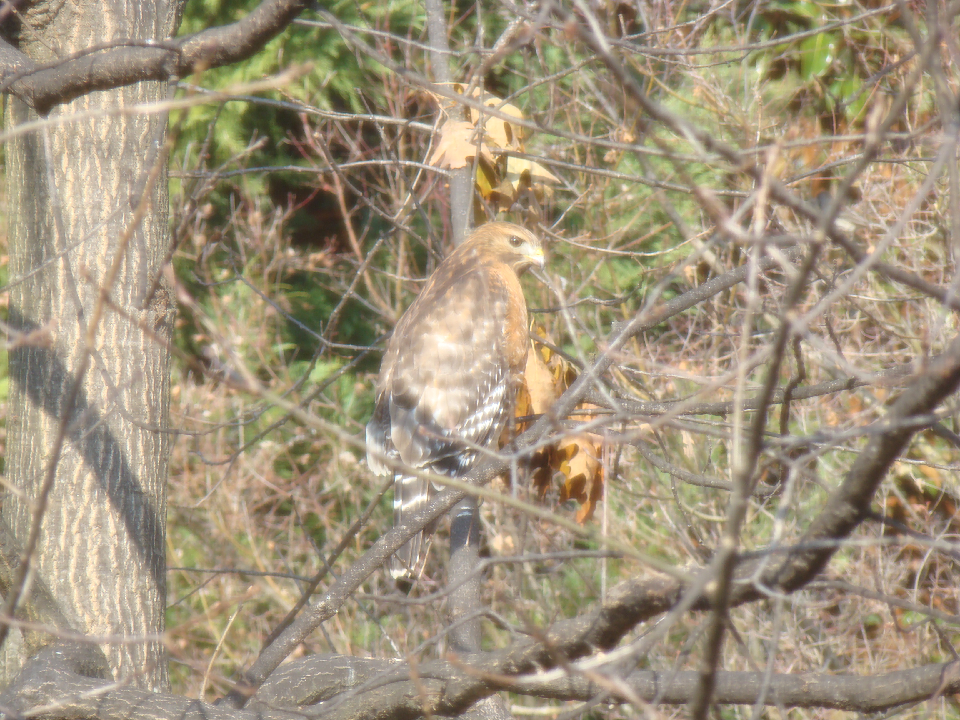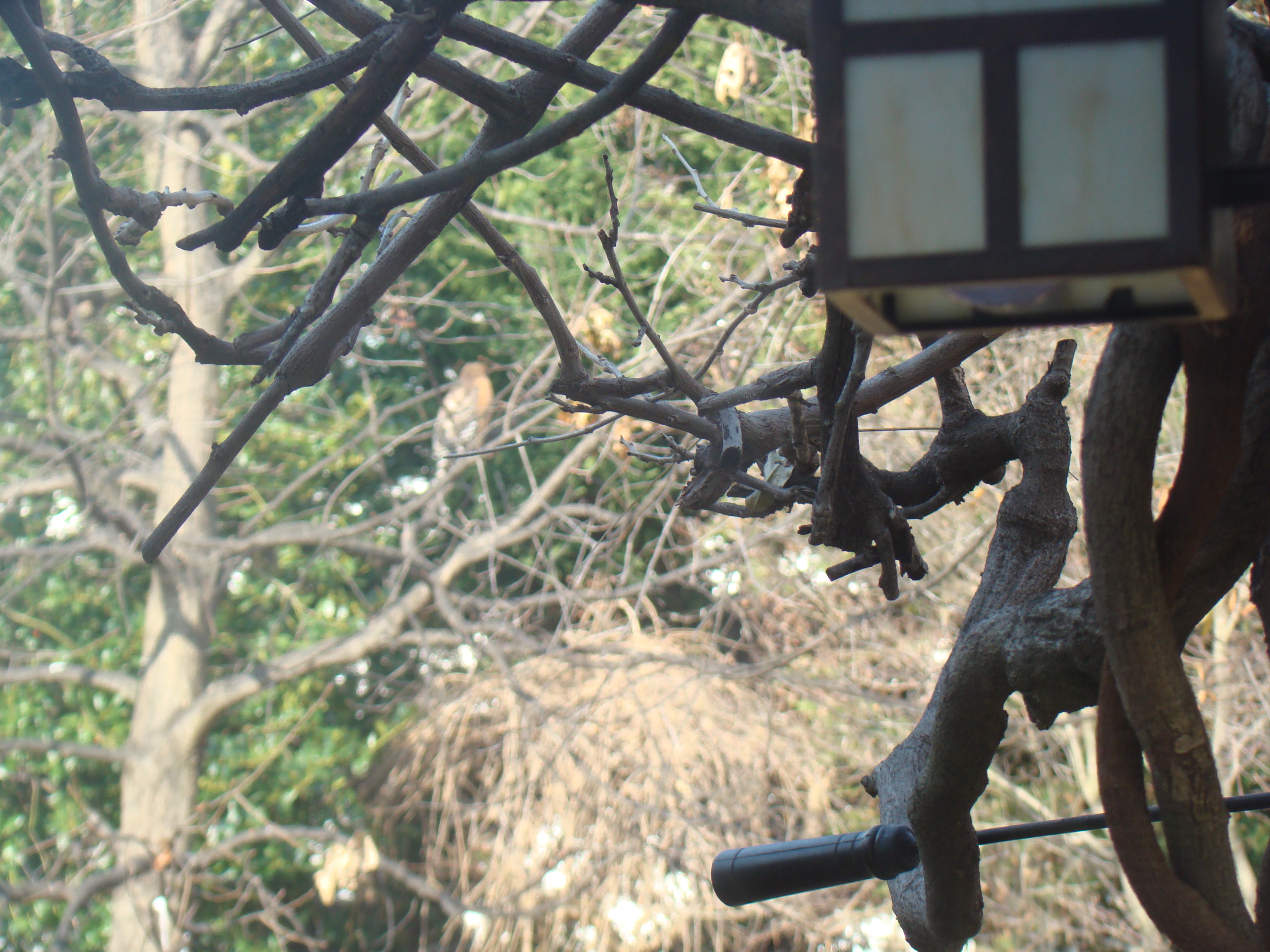 Hoy después de que Klau terminó de diseñar unos diagramas para los manuales y las presentaciones del curso que daremos en México este Diciembre, se fue a la cocina preparando el almuerzo. Cuál fue su sorpresa que al mirar hacia el jardín teníamos un visitante muy especial. Me habló con ese timbre de emoción característica cuando algo nuevo e interesante está pasando pidiéndome que fuera con ella. Había una ave bien podría un águila o halconcillo, que realmente no importa, parada en nuestro «árbol especial» del jardín.